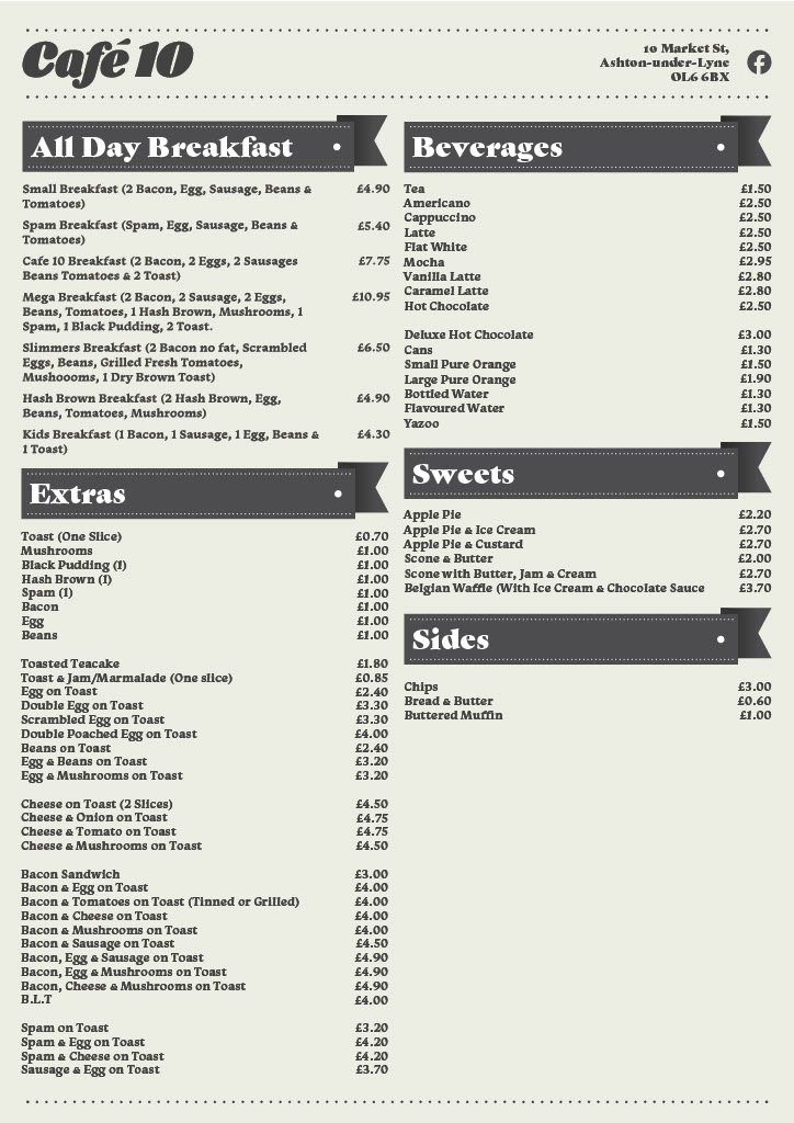 Nestled at 10 Market St in Ashton-under-Lyne, Cafe 10 stands out as a charming spot for food lovers. Renowned for its all-day breakfast options, the menu features delectable choices like the classic Veggie Breakfast and the hearty Spam Breakfast, ensuring an energizing start to your day.